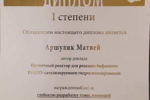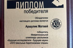 На Харитоновских чтениях в Сарове 12-15 февраля 2026 г. учащийся 11-Х класса СУНЦ МГУ Матвей Аршулик получил Диплом I степени и стал победителем Межрегиональной олимпиады школьников «Будущие исследователи — будущее науки» в секции «Химия».